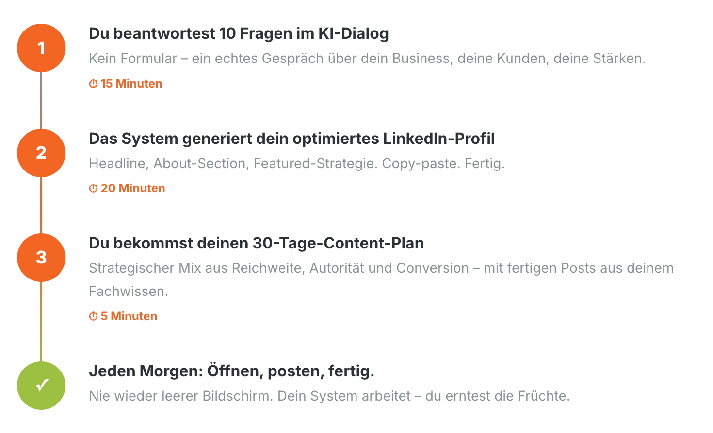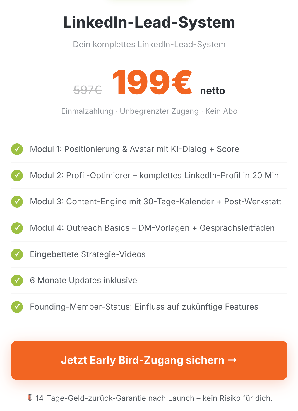 💡 Du willst das sofort umsetzen statt weiterlesen? Das Clever Mangos LinkedIn Lead System führt dich mit KI-Dialogen und Strategie-Videos durch alle 5 Bausteine. → Zum Early Bird-Zugang