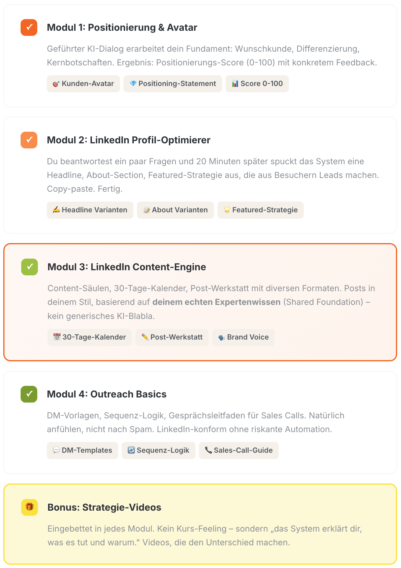 Bonus: Eingebettete Strategie-Videos, die dir in jedem Modul das „Warum" erklären – kein 8-Stunden-Kurs, nur das, was du brauchst.