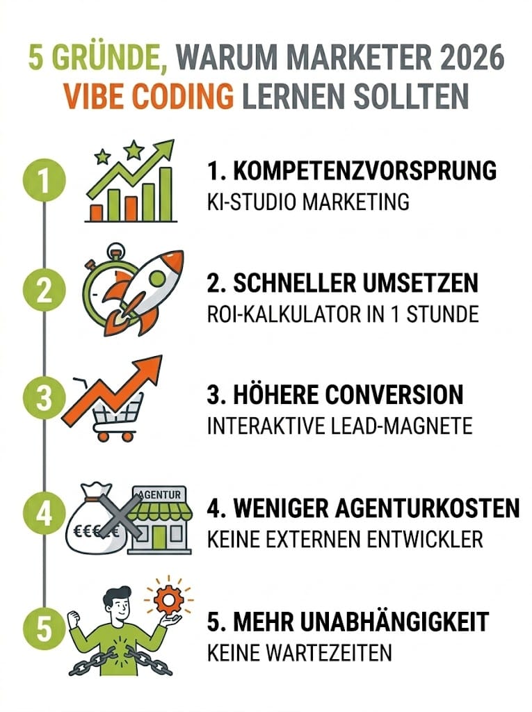 Die Frage ist nicht ob Vibe Coding Marketing verändern wird. Es tut es bereits. Die Frage ist nur: Bist du dabei, wenn es passiert – oder schaust du von der Seitenlinie zu?